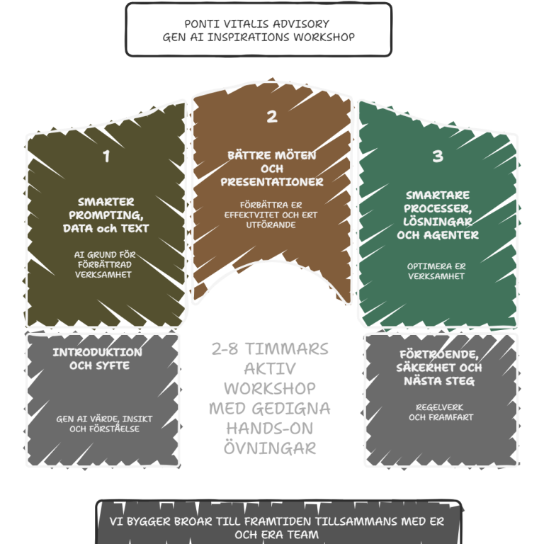 Vår workshop har focus på inspiration och lärande, det kommer att öppna era ögon för både kortsiktiga förbättringar och större förändringar. Vi kommer i er workshop att jobba med mycket egna övningar och testa och prova på olika verktyg för att på ett så effektivt sätt bygga kunskap och väcka er inspiration för att utforska Gen AI möjligheter.